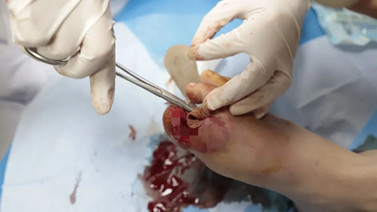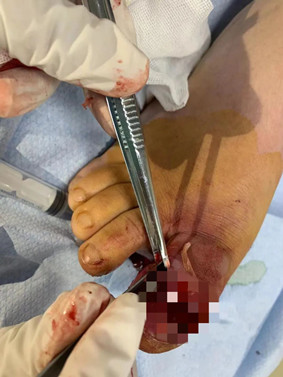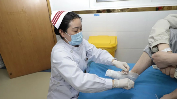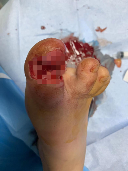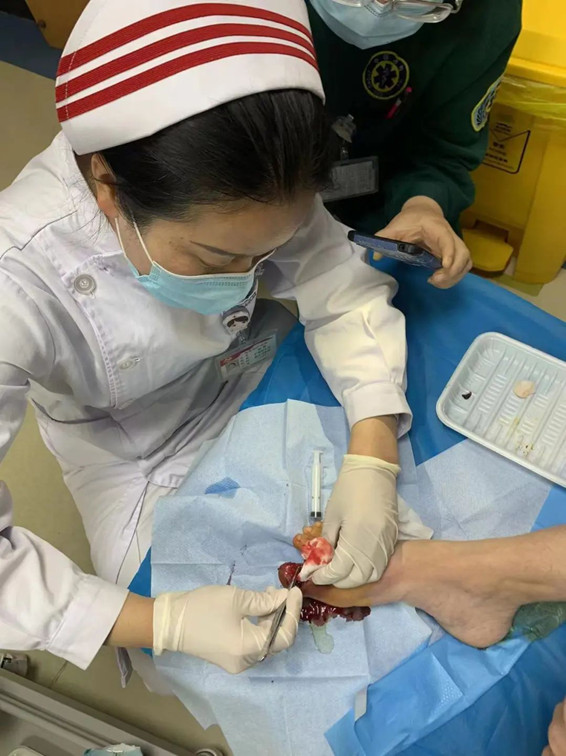 傷口門診負(fù)責(zé)人護(hù)理部主任趙靜詳細(xì)為患者進(jìn)行了檢查,發(fā)現(xiàn)其趾甲部分?jǐn)嗔眩诇霞t腫、破潰,無活動性出血,腳面腫脹明顯,疼痛不能耐受,既往傷口處曾自涂云南白藥3天。趙靜主任發(fā)現(xiàn)患者情況不能再拖延,當(dāng)即在局麻下為患者進(jìn)行右足感染傷口切開引流術(shù),引流出大量膿液,因感染嚴(yán)重,指甲拔除,傷口處給予“插花”引流。目前患者正在恢復(fù)當(dāng)中。
